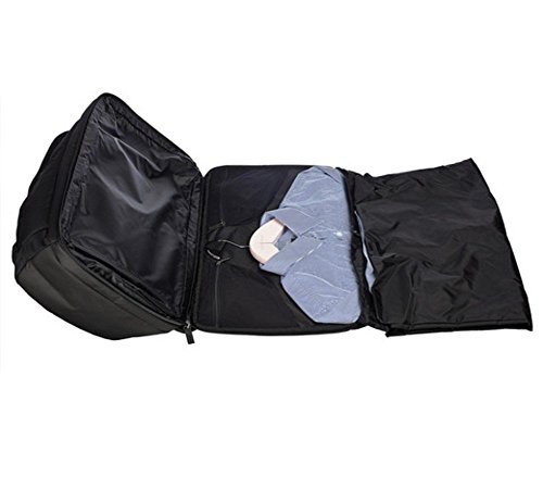 -. Feature : Rear zipper flaps open to a tri-fold suiter for garments / Padded compartment fits up to 16" laptops / Padded tablet compartment / Exterior access smartphone pocket with audio port / Mesh organization compartments for water bottle, tech accessories.