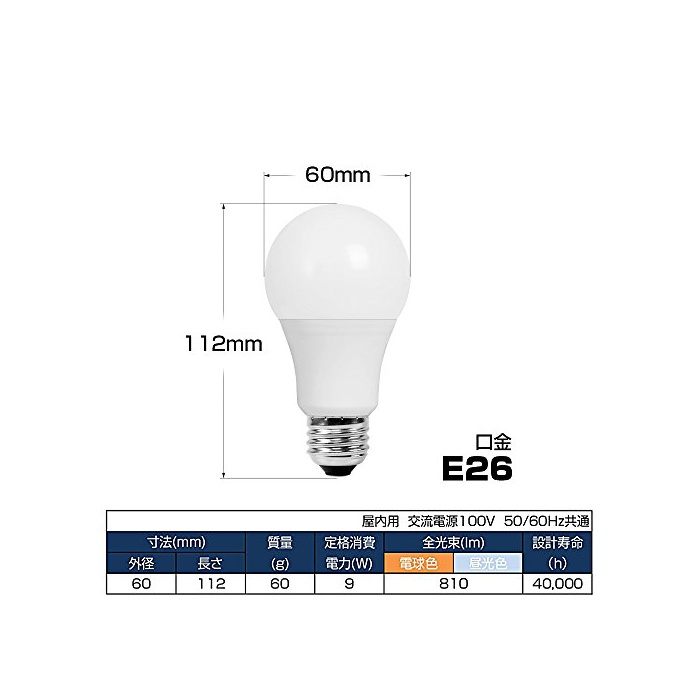 원본상품명: LED電球 E26 60W形 100W形相 密閉器具 配光タイプ 熱材施工器具 26mm 26口金 一般電球 電球色 光色 照明器具 LEDライト 長命 省エネ