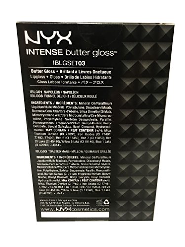 NYX Intense Butter Gloss, 3 Piece Set, Napoleon, Funnel Delight. Smother your lips with a silky gloss bursting with color! NYX Cosmetics Intense Butter Gloss keeps your lips soft and glossy without being sticky. Easy to Use Wand Applicator. Drench your lips in extreme color.Feature