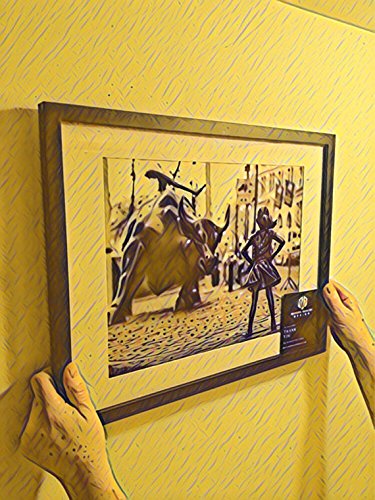 Featuring framed photograph of 2 iconic statues in financial district in lower Manhattan Fearless Girl staring down Wall Street bull.