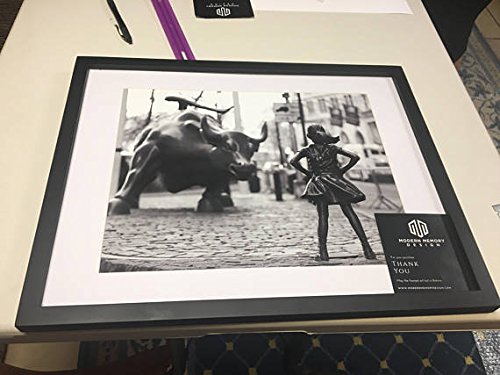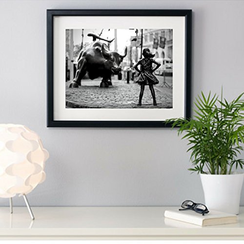 11x14 print of Fearless girl looking fearlessly at Wall street bull framed in black pine wood frame 14x18 inch finished with glass and white mat... ready to hang