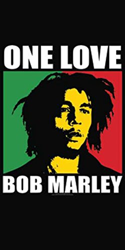 Bob Marley Beach Towel featuring print of Bob Marley with "One Love Bob Marley" quote.