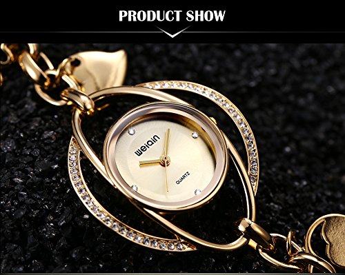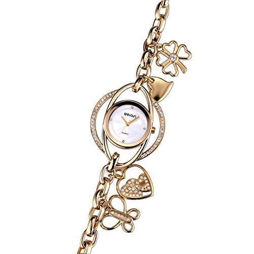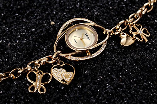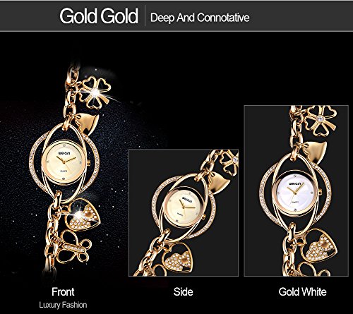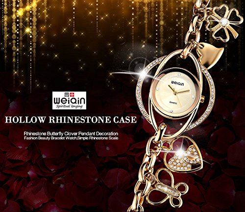 - ✿LUXURY ELEGANT DESIGN: Gold bracelet watch,chain with Clover love shape butterfly, case with same color index casual style, along with rhinestone hour marks, effortlessly elegant and luxury, showing the time clearly.