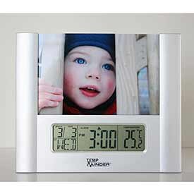 Studio : Minder Research Inc Publisher : Minder Research Inc Binding : Electronics Product Description This unique LCD Thermometer and Clock with digital display holds a 4x6 photograph for personalization. The clock with alarm and snooze will wake you to one of seven different tunes and will even play "Happy Birthday To You" on your birthday. Also includes 0