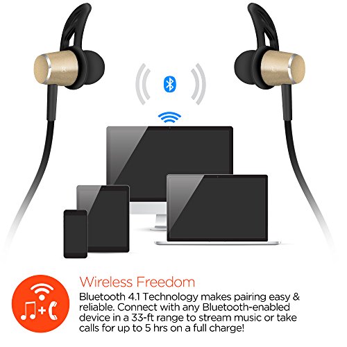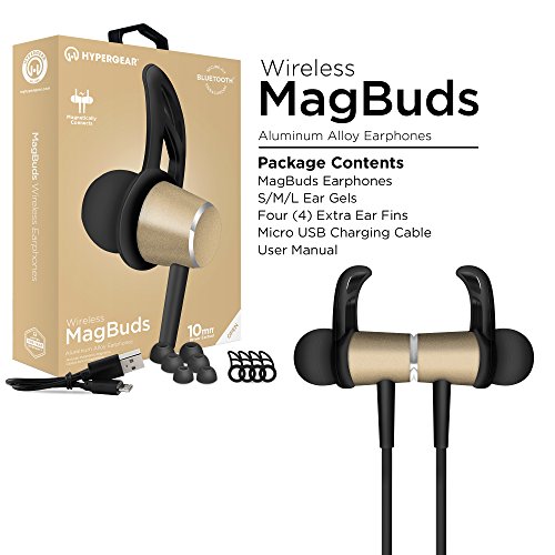 -. Binding : Wireless Phone Accessory -. Brand : HyperGear -. Feature : Universal Compatibility MagBuds Earphones are made to work with the latest Bluetooth-enabled Apple and Android smartphones, tablets, wearables and gaming devices. / Wireless Freedom Engineered with the latest Bluetooth 4.1 Technology for the best sounding and most reliable wireless transmission possible (up to 33 ft range!). Enjoy quick and easy pairing and a solid signal connection that ensures you never miss a call or beat. / Engineered to Move When you move, you want earphones that stay in! The ear fins are designed with an extended wing shape that securely fits into the contours of your ear, spreading contact evenly to provide extra support that will hold your MagBuds in place even through the toughest workouts. / Noise Isolating Microphone Don't miss that call! The MagBuds double as a wireless headset with an inline microphone that isolates your voice from background noises for crisp and clear conversations. / Power Through Your Day The extended lithium-ion battery provides up to 5 hours of playtime and 150 hours standby on a single charge. It only takes about 2 hours for these wireless earphones to quickly recharge and be ready for your next adventure! -. Label : HyperGear -. Manufacturer : HyperGear -. PackageQuantity : 1 -. ProductGroup : Wireless -. ProductTypeName : WIRELESS_ACCESSORY -. Publisher : HyperGear -. Studio : HyperGear -. Title : HyperGear MagBuds Wireless Aluminum Alloy Earphones - Gold