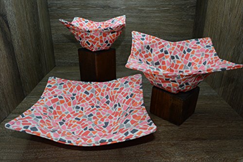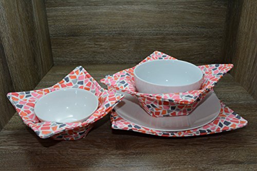 Product Description Microwave cozy set includes 1 small bowl cozy (Approx 6.5" sq), 1 medium bowl cozy (Approx 8" sq), 1 dinner plate cozy (Approx 10" sq.) The dinner plate cozy can also be used for round casserole dishes and the small size is great for coffee mugs! These microwave cozies are the perfect solution to handling super-hot dishes. Cooking and reheating food in a dish cozy makes life so much easier! Place your microwaveable dish inside the bowl cozy and put the whole thing in the microwave to heat. To take the bowl out, you simply grab the corners of the cozy. We found that our kids can now get their dishes out of the microwave safely. Cozies will also protect your fingers from the cold when holding a bowl of ice cream and are great for protecting your table. You can also use a cozy placed on top the dish you are microwaving to help steam food. MATERIALS: * 100% cotton fabric * 2 layers of 100% cotton batting * 100% cotton thread Please be advised: Bowl cozies must only be used in microwaves with a rotating base. To avoid scorching or burning, please make sure cozy freely rotates in your microwave. Never leave microwave unattended. Make sure cozy is clean with no pieces of food attached. Do not microwave cozy for more than three minutes. Cozies can be machine washed on delicate cycle. Reshape and allow to air dry for best results. Please let us know if this is a gift, and we will ship without a packing slip enclosed! #bowlcozy #microwaveable #handmadeatamazon #hot4handmade #buyhandmade 0