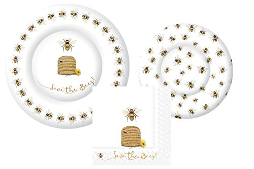- "Save the Bees!" themed paper product bundle includes: (8) dinner plates, (8) dessert plates, and (20) luncheon napkins
