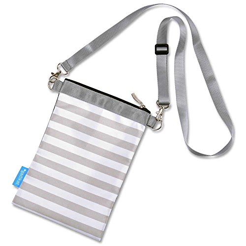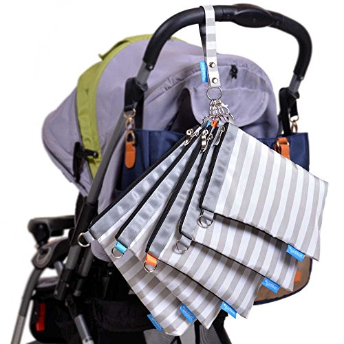 Pouches are different sizes and linked to a universal ring (and effortlessly separable). With a snap button on the handle, the product is easily hung on a variety of places, i.e. baby strollers or other objects. Additionally, each of these pouches have two side hooks, with a strap included, allowing each bag to become a shoulder bag.