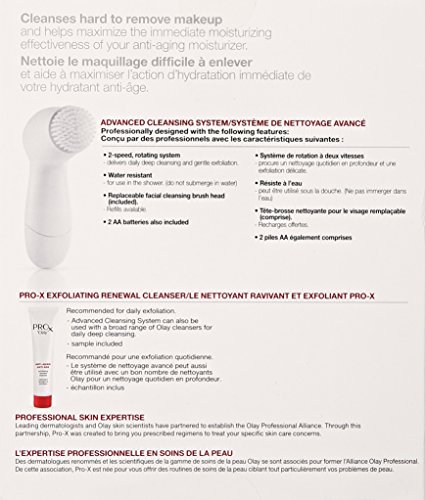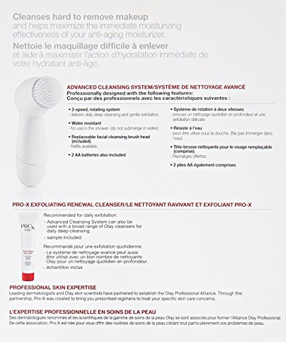 Take your facial cleansing routine to a whole new level. ProX by Olay Advanced Cleansing System delivers superior cleansing on hard-to-remove makeup. The 2-speed rotating facial cleansing brush massages the ProX by Olay Exfoliating Renewal Cleanser onto the skin. The lathering formula thoroughly cleans as it gently exfoliates. The system was professionally designed to deliver proven results. Just rub cleanser onto your skin and let the power of the Facial Cleansing Brush go to work. Each rotation gently exfoliates and cleanses hard-to-remove makeup, leaving your face clean and primed for hydration. In fact, the ProX by Olay Advanced Cleansing System is designed to maximize the immediate hydrating effectiveness of your anti-aging moisturizer. With 2 speeds, you can control how the cleansing brush treats your skin. Plus, it's water resistant, making it perfect for use in the shower. When used with the Exfoliating Renewal Cleanser, your skin will feel smooth and refreshed. We promise your satisfaction with this product or we'll refund your money. Call 1-866-710-PROX (7769) with original receipt within 60 days of purchase. Limit one refund per household. www.olay.comFeature