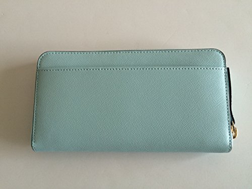 A beautiful saffiano leather with many great features in a soft pale blue color. There is a back slip pocket, zip closure to keep things secure. Fully lined in a soft sateen with 14-karat gold plated hardware. 12 credit card slots, a center zip pocket, 2 full length bill slip pockets, 2 large expandable pockets, can easily hold a cell phone. Measures: 8" (W) X 4"(H) X 2"(D)Feature