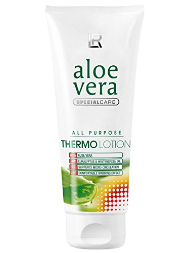 LR Aloe Vera Thermo Lotion WITH 45% Aloe Vera Lightly warming and skin nourishing lotion. Conditions with natural oils, eucalyptus & winter green oil. Aids with a pleasant warming effect. Olive, jojoba, apricot kernel, sesame oils nourish and leave the skin feeling velvety Gently massage into skin. 100 ml For stressed muscles, ideal as a massage cream by the addition of natural oils. - A unique recipe - With 45% Aloe Vera Gel - Menthol, eucalyptus, and wintergreen oil, jojoba, apricot kernel and sesame oil Action: - Soothing heat effect, which relaxes - Thermal effect stimulates circulation Contents: 100 mlFeature