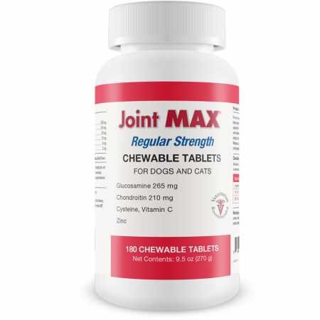 Joint MAX RS helps ease stiffness and promotes healthy cartilage and joints. Glucosamine and Chondroitin work together to promote improved joint health by strengthening your dog's cartilage. It also contains Vitamin C, Zinc and N-Acetyl-Cysteine for added joint healing. Recommended for dogs that show moderate signs of arthritis.You should use this if your pet is experiencing one of these symptoms. • Stiffness after exercise • Difficulty jumping or climbing stairs • Walking more slowly • Hopping instead of runningJoint MAX can be used alone or in combination with prescription drugs like Rimadyl, Etogesic, or Deramaxx and can eventually help decrease the need for these drugs. Joint MAX Customer Feedback--> Reviewers Ratings :: My cat has been taking JointMAX liquid for just over 3 weeks. I sincerely thank you for creating a formula for cats that is "doable". I purchased another brand's chewable tablets for him, but a steak knife would not cut those pills and my cat was not interested. I think I already see positive results and am thrilled! Reviewers Ratings :: Joint MAX has done wonders for my 8 year old Lab. He is more active and happier and even loves the taste. Read More Joint MAX Testimonials! Active Ingredients per (Tablet): Glucosamine HCl (Shellfish Source) - 265 mg Chondroitin Sulfate (Porcine Source) - 210 mg Ascorbic Acid (Vitamin C) - 25 mg Cysteine - 15 mg Manganese - 6 mg Zinc - 2 mg Inactive Ingredients: Amino Acid Chelate, Animal Liver Meal, and Beef FlavorFeature