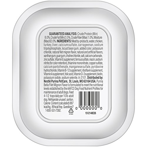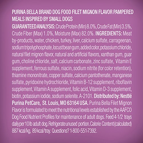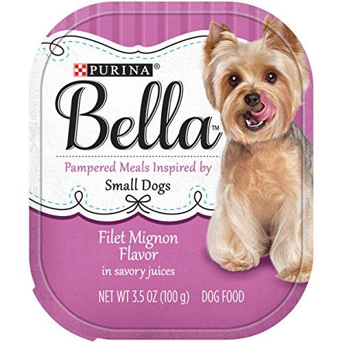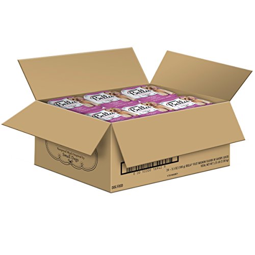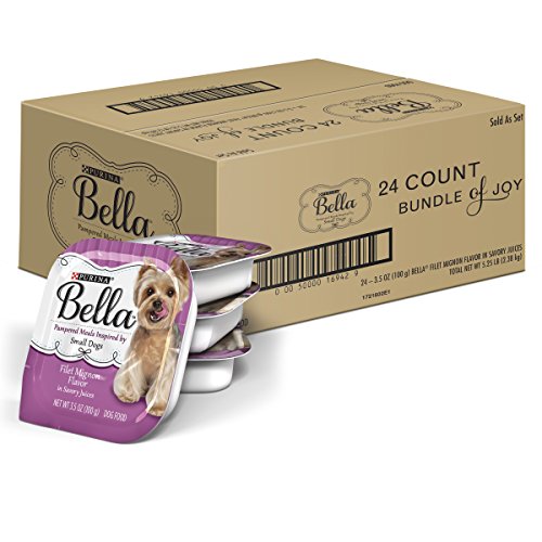 -. Binding : Misc. -. Brand : Purina Bella -. Feature : Twenty-four (24) 3.5 oz. Trays - Purina Bella Pampered Meals Filet Mignon Flavor in Savory Juices Wet Dog Food / Formulated for small adult dogs / Supports health throughout the longer life expectancy of small dogs / 3.5 oz. trays - a small size for small dogs / Blend of antioxidants to help support your small dog's immune system -. Label : Nestlé Purina Wet High Velocity -. Manufacturer : Nestlé Purina Wet High Velocity -. Model : 16942 -. MPN : 16942 -. NumberOfItems : 24 -. PackageQuantity : 1 -. PartNumber : 16942 -. ProductGroup : Pet Products -. ProductTypeName : PET_SUPPLIES -. Publisher : Nestlé Purina Wet High Velocity -. Size : (24) 3.5 oz. Trays -. Studio : Nestlé Purina Wet High Velocity -. Title : Purina Bella Pampered Meals Filet Mignon Flavor in Savory Juices Adult Wet Dog Food - (24) 3.5 oz. Trays
