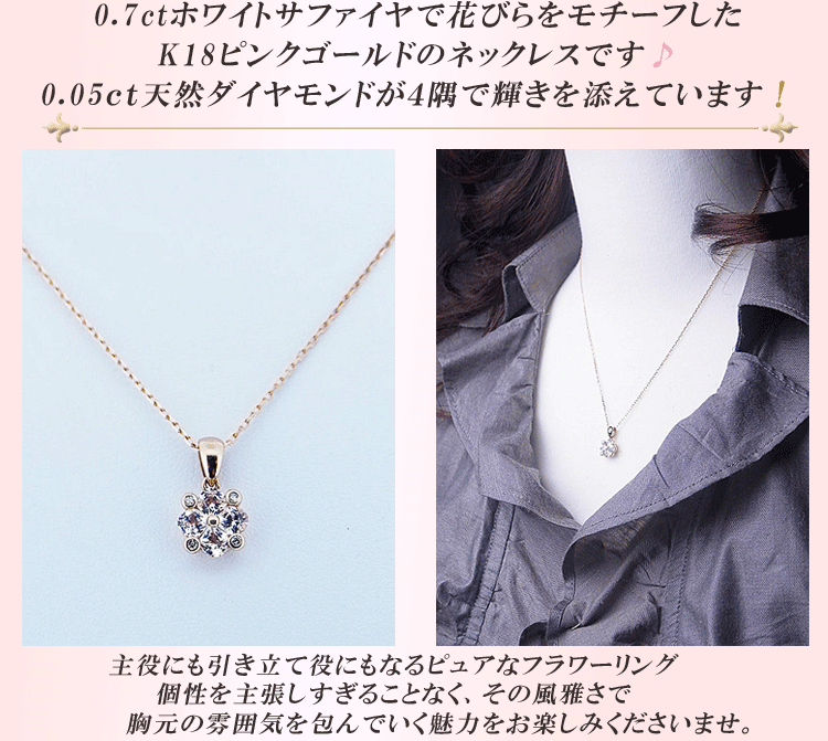 商品説明 0.7cホワイトサファイヤで花びらをモチーフしたK18ピンクゴールドのネックレスです。0.05ct天然ダイヤモンドが4隅で輝きを添えています。