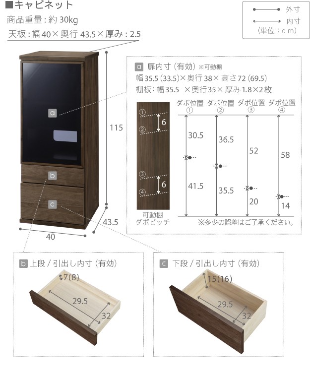 引出し内寸(上段/下段):幅29.5x奥行32x高さ7(有効8)/15(有効16)cm