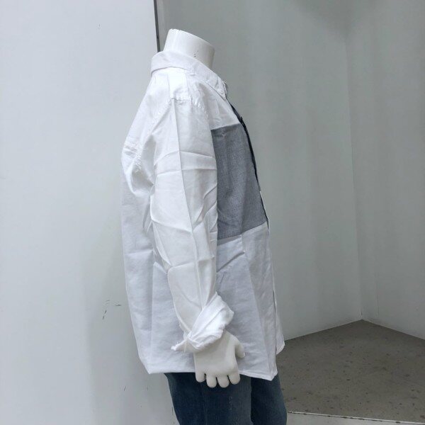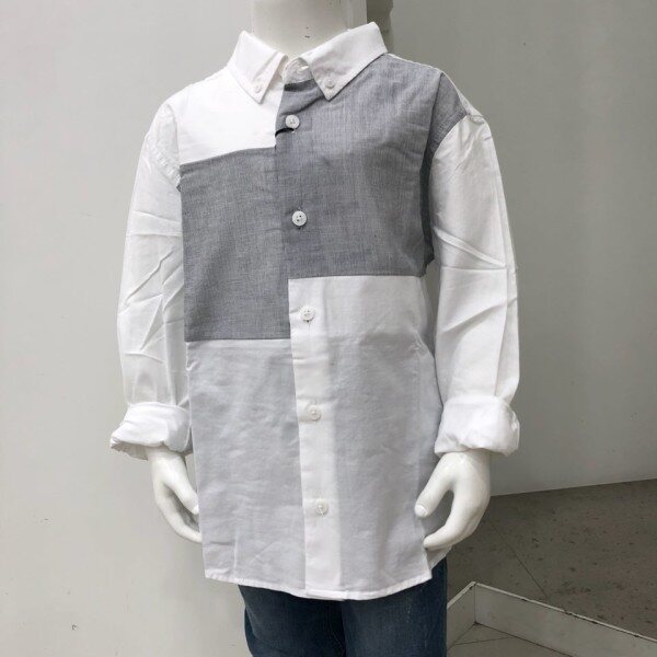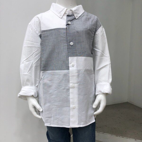 2018년 가을 신상 필라필 언발란스블럭 버튼다운셔츠 입니다. 남아 버튼 다운 디테일로 깨끗한 화이트 몸판에 앞 가슴 절개 배색이 있는 디자인 입니다. 패밀리룩으로 착용 가능한 셔츠로, 성인 남성의 경우 NMF CSL102 품번을 참고하시면 됩니다.