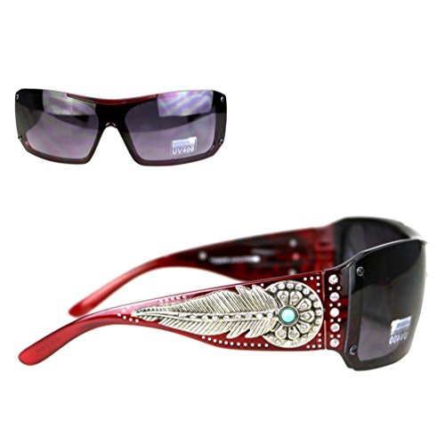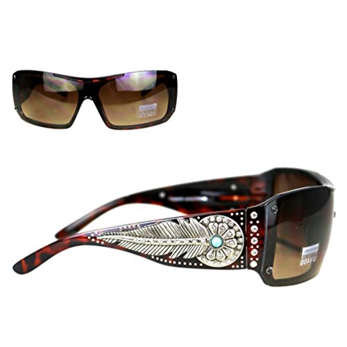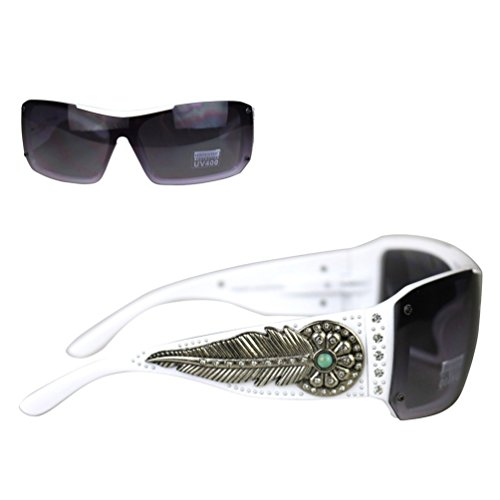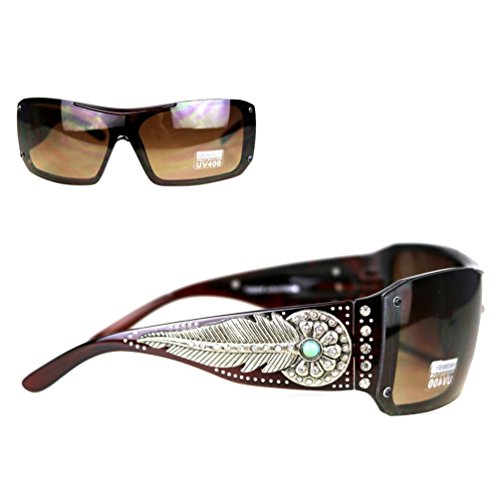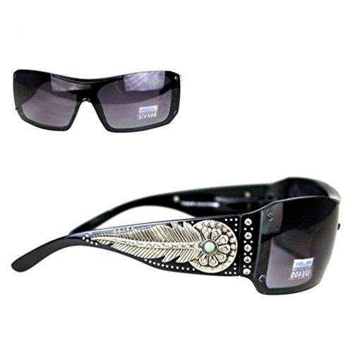 Product Description Montana West brand ladies Concho Collection sunglasses. Western style design features a rhinestone encrusted silver daisy and feather concho with turquoise stone center on each ear piece, and embellished with more rhinestones on the eye pieces. 0