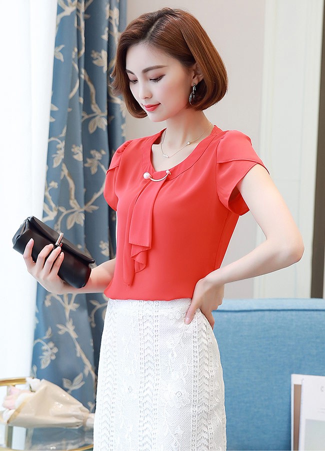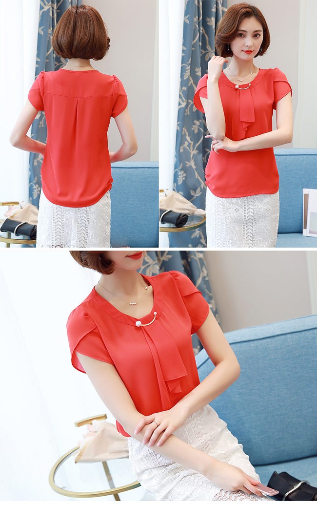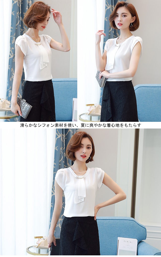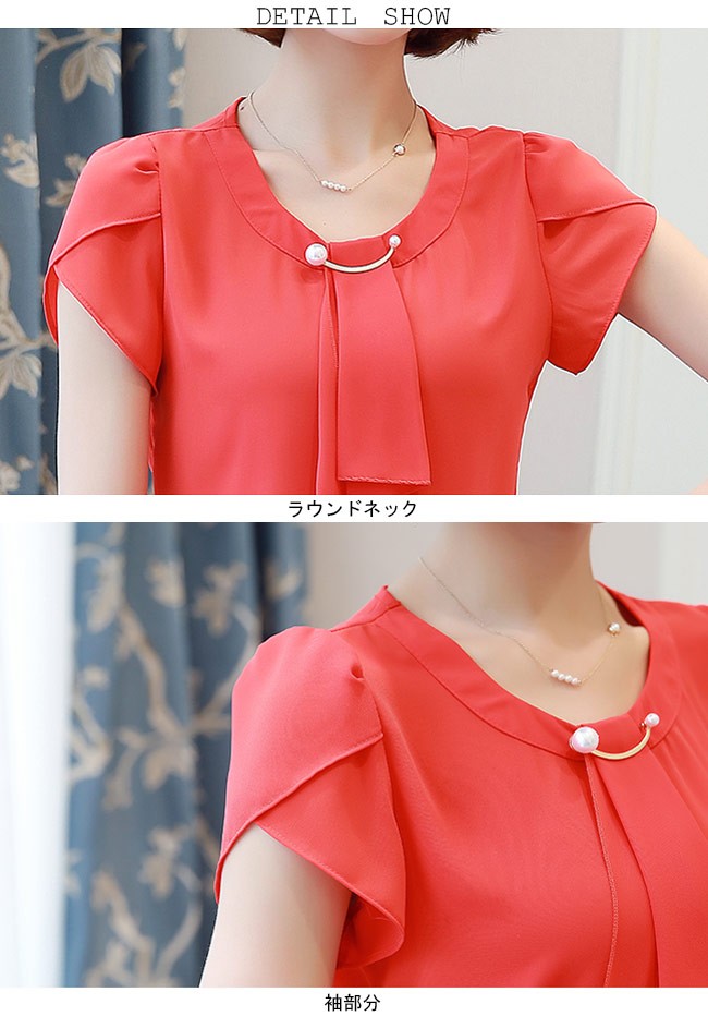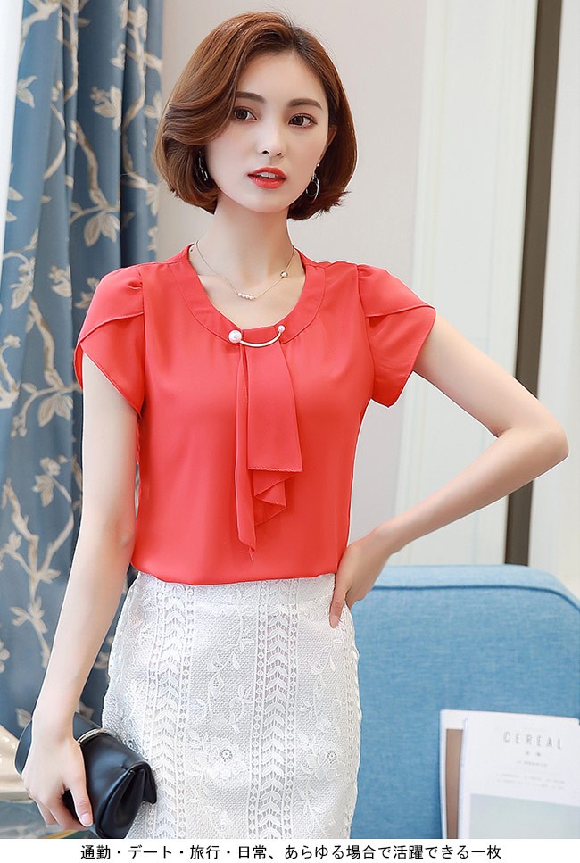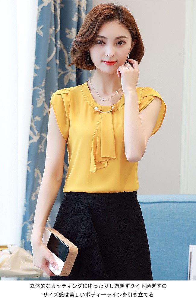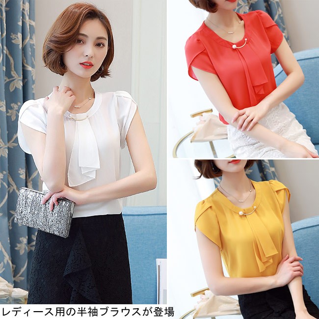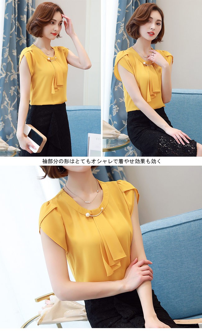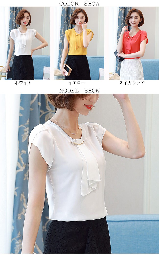 シフォンブラウス 半袖 レディース 通勤 半袖ブラウス 体型カバー 丸襟 半袖Tシャツ 女性用 トップス シフォン 夏物 薄手 着やせレディース用の半袖ブラウスが登場滑らかなシフォン素材を使い、夏に爽やかな着心地をもたらす立体的なカッティングにゆったりし過ぎずタイト過ぎずのサイズ感は美しいボディーラインを引き立てる袖部分の形はとてもオシャレで着やせ効果も効く飾りネクタイとブローチのデザインは働く女性ならではのスッキリな気質を演出通勤・デート・旅行・日常、あらゆる場合で活躍できる一枚カラー:ホワイト イエロー スイカレッド素材 ポリエステルサイズ(cm) S M L XL 2XLS 肩幅33 バスト86 着丈61M 肩幅34 バスト90 着丈62L 肩幅35 バスト94 着丈63XL 肩幅36 バスト98 着丈642XL 肩幅37 バスト102 着丈65ご注意:※サイズは平置きサイズです。素人採寸ですので、若干の誤差がございます、ご了承ください。
