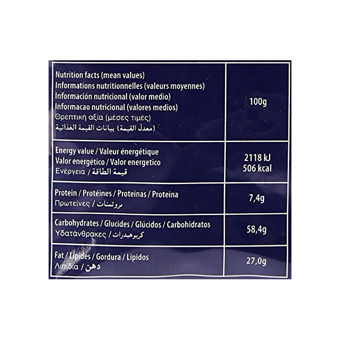 원재료:소맥분,코코넛 오일,글루코스 시럽,설탕,저 지방 코코아,포도당,《호에이파우다》(유제품)고, 대두분,쵸코렛,탈지분유,맥아 엑기스,소금,《헤제루낫츠》,팽창 제,유화 제(대두 유래)고, 향료