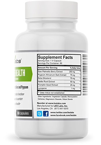 -. Binding : Health and Beauty -. Brand : LES Labs -. EAN : 0091037958037 -. Feature : SUPPORTS HEALTHY PROSTATE FUNCTION. Natural ingredients promote prostate health and function. / REDUCE BLADDER DISCOMFORT. Helps to reduce bladder discomfort and promote urinary flow. / PROMOTES URINARY TRACT HEALTH. Herbal extracts to support urinary tract health and to help relieve the consistent urge "to go". / NATURAL DRUG-FREE FORMULA. Natural formula with saw palmetto, pygeum bark, beta-sitosterol, lycopene and pumpkin seed extracts. / 1 CAPSULE DAILY. 100% MONEY-BACK GUARANTEE. Try Prostate Health and see how it works for you. All LES Labs supplements include a 60-day money-back guarantee. Our supplements are manufactured in the USA with the highest-quality ingredients from around the world. -. IsAdultProduct : 0 -. Label : LES Labs -. Manufacturer : LES Labs -. MPN : 2826665031 -. PartNumber : 2826665031 -. ProductGroup : Health and Beauty -. ProductTypeName : HEALTH_PERSONAL_CARE -. Publisher : LES Labs -. Studio : LES Labs -. Title : Prostate Health (60 Capsules) • Supports Prostate Function • Helps Reduce Bladder Discomfort • Promotes Urinary Tract Health • With Saw Palmetto, Pygeum & Beta-Sitosterol • 100% Money-Back Guarantee -. UPC : 091037958037