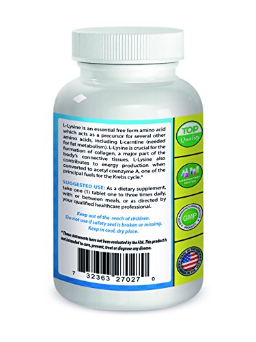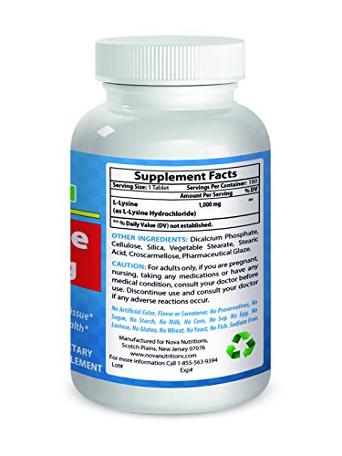 -. Binding : Health and Beauty -. Brand : Nova Nutritions -. EAN : 0732363270270 -. Feature : L-lysine supports immune system function* / L-lysine may support a healthy cardiovascular system* / L-lysine supports calcium absorption, making it more available for biological functions* / Essential Natural amino acid / Nova Nutritions products are manufactured to high standards of quality, efficacy and safety. All Nova Nutritions Products are manufactured in accordance with Good Manufacturing Practices (GMP), among the highest standards in the world -- Proudly Made in USA -- Purity & Potency Guaranteed -. IsAdultProduct : 0 -. Label : Nova Nutritions -. LegalDisclaimer : * These statements have not been evaluated by the Food and Drug Administration. This product is not intended to diagnose, treat, cure or prevent any disease. -. Manufacturer : Nova Nutritions -. PackageQuantity : 1 -. ProductGroup : Health and Beauty -. ProductTypeName : HEALTH_PERSONAL_CARE -. Publisher : Nova Nutritions -. Studio : Nova Nutritions -. Title : L-Lysine 1000 mg 180 Tablets by Nova Nutritions -. UPC : 732363270270