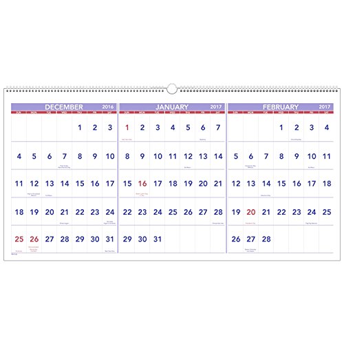 -. Feature : Three-month reference horizontal calendar gives you a large date range to view while making plans. Calendar covers 15 months from December to February providing long term planning power. / Wall calendar displays three months per page in one of two formats. Choose to view past, current and future months at once or current plus two future months. Horizontal orientation is ideal for placement in cubicle-sized spaces. / Calendar is wirebound with a hanging loop for easy wall display. Page size 23.5 in. x 12 in.. Overall size 23.5 in. x 12 in. x.19 in.. / Large daily blocks show each date in bold P.R.Int and centered. Dates of federal holidays are red to ensure clear visibility and easy differentiation of dates. / P.R.Inted on quality paper containing 30% post-consumer recycled material. Sturdy chipboard back improves durability.