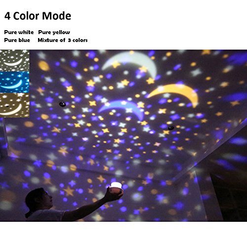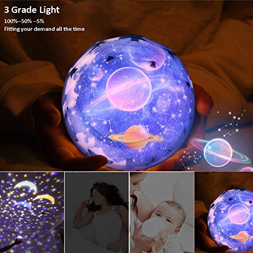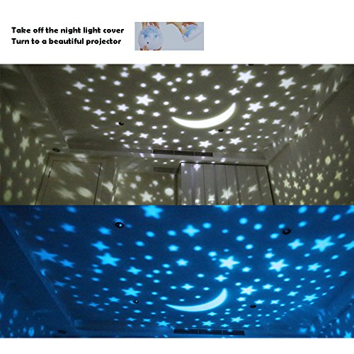 360 Degree Rotate and IC Dimming Core : a great night light projector for kids. No noise 360 degree rotating lights with the moon and stars can make nice atmosphere for kids' sleep.Light brightness has 3 grades--- 5%,50% and 100% .