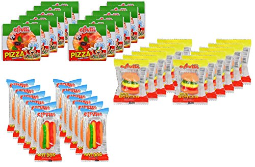 -. Feature : TWELVE GUMMY PIZZAS (.54 oz) - Adorable little realistic mini pizzas with small, cheeky mushrooms, fruity pieces of tomato, green pepper and melted mozzarella (5 slices per box) / TWELVE GUMMY HOT DOGS (.35 oz) - Tiny hot dogs with a soft gummy bun, sausage, ketchup, mustard and relish layered with flavors of Fresh Pineapple, Strawberry, and a hint of Yogurt & Cream / TWELVE GUMMY BURGERS (.35 oz) - Separate layers of bun, lettuce, cheese and meat in flavors of Rhubarb, Raspberry, Strawberry, Pineapple, Kiwi and Gooseberry with a hint of Yogurt & Cream / TOTAL OF 36 PIECES - Fruity, flavorful and yummy! / MADE IN THE USA - A huge hit with kids and adults alike at parties or as gifts