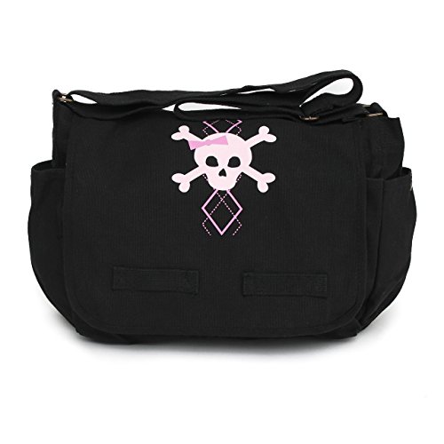 Product Description Cool Canvas diaper bag with our signature Argyle Skull in color Pink. Designed in the USA by Crazy Baby Clothing. It has an enormous main compartment that can fit your dippers, wet wipes, changing mat, several bottles and cloths. The is an inside zipper pouch for pacifiers, car keys and wallet. The bag has two outside and two inside pockets for bottles dippers and wipes. 2" wide adjustable shoulder strap with Brass hardware, Bag Dimensions 15"x11"x6" 0