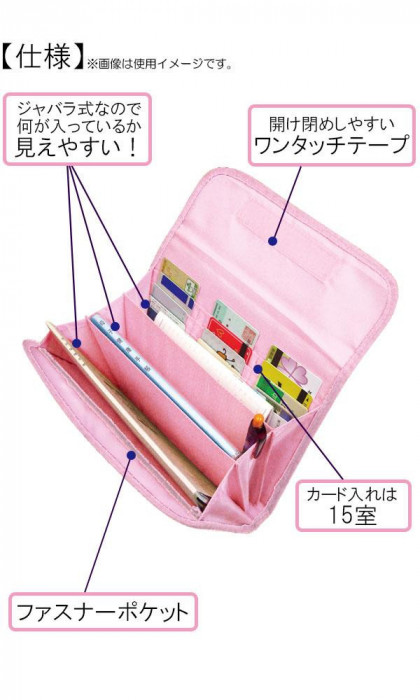 | 仕様 | カード収納枚数:15枚 ファスナーポケット:1つ ジャバラ式ポケット:1つ(3室) |
