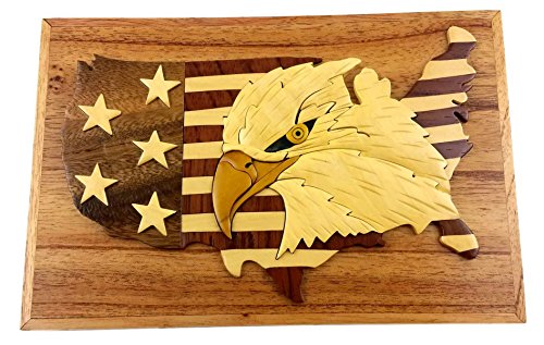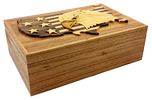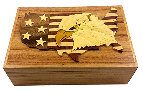 "USA Eagle Flag", 9 x 6 x 3" Jewelry/Storage Box. All Natural Exotic Woods with Brass Hinged Lid. Hand-made Wood Onlay Design on Lid.