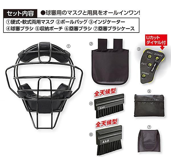 | セット内容 | 硬式・軟式両用マスク、ボールバッグ、インジケーター、球審ブラシ、収納ポーチ、塁審ブラシ、塁審ブラシケース |