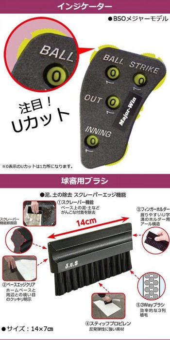 | 軟式・硬式両用で使用できる球審用具のセット。 |