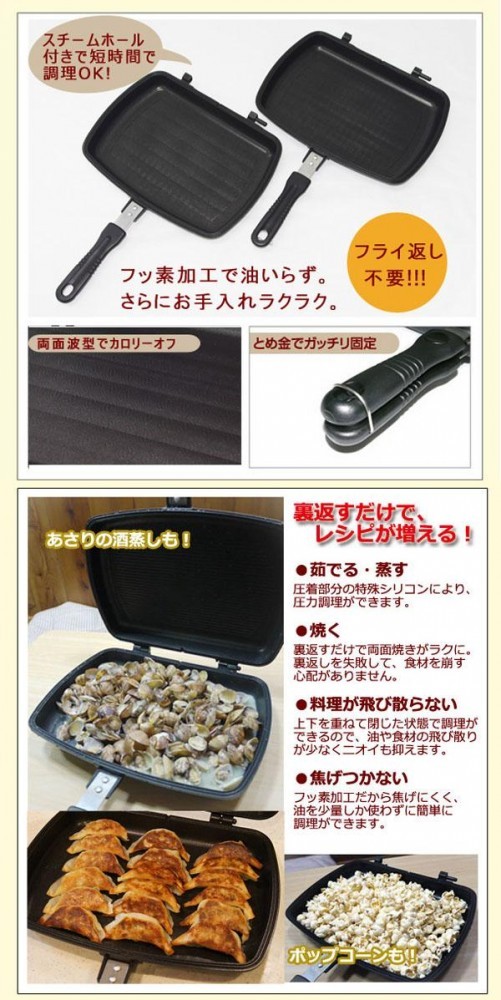 上下ともにフライパンの機能を持った両面フライパンです。上下を重ねた状態で調理できる優れもの!波型なので油も切れてヘルシーです。フッ素樹脂加工なので焦げ付きにくく、油少量で簡単に調理ができます。また、上下を取り外し別々で使う事も可能です。 |