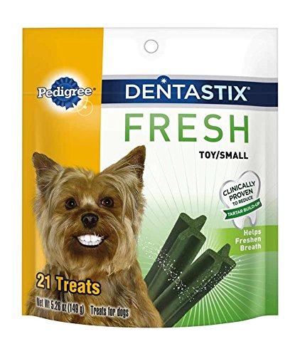-. Binding : Misc. -. Brand : Pedigree -. EAN : 0023100103099 -. Feature : Contains (6) 21-count packs of PEDIGREE DENTASTIX Fresh Mini Treats for Dogs / PEDIGREE DENTASTIX Triple Action: Reduces tartar buildup, cleans teeth and freshens breath / Our dental sticks have an X-shape design and are specially designed for adult toy and small breed dogs / Feed one PEDIGREE DENTASTIX Oral Care Treat every day for maximum benefits / PEDIGREE DENTASTIX Dental Chews feature a fresh mint flavor that small dogs love -. Label : TV Non-Branded Items (Pets) -. Manufacturer : TV Non-Branded Items (Pets) -. Model : 10119169 -. MPN : 10119169 -. NumberOfItems : 6 -. PackageQuantity : 1 -. PartNumber : 10119169 -. ProductGroup : Pet Products -. ProductTypeName : PET_SUPPLIES -. Publisher : TV Non-Branded Items (Pets) -. Size : 5.26 oz. (Pack of 6) -. Studio : TV Non-Branded Items (Pets) -. Title : PEDIGREE DENTASTIX Fresh Mini Treats for Dogs - 5.26 oz. 21 Count (Pack of 6) -. UPC : 023100103099