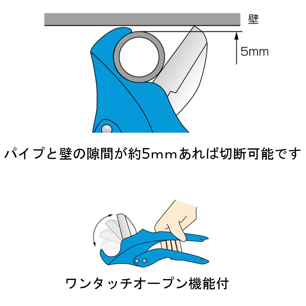 Because the opening of the blade is narrow, you can cut it if the gap between the pipe and the wall is about 5 mm