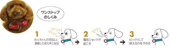 わんちゃんの3回以上連続した吠え声に反応し、電気ショックが起こります。これを何度か繰り返し教えることで吠えるとショックがくることを学習します。 | |
