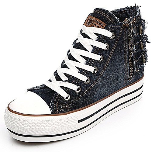 -. Feature : デニム生地を使用した、ハイカットデザインウエッジソール厚底スニーカーです。 / ハイカット&厚底デザインでスタイルアップ!脚長効果も期待できる一品です♪ / サイドジッパーとベルトデザインがスタイリングのアクセントにGOOD! / ほど良いヴィンテージ加工がこなれ感を演出!カジュアルからきれいめ、ガーリーまで様々なコーディネートにマッチします。 / 【カラー】ブラック ライトブルー