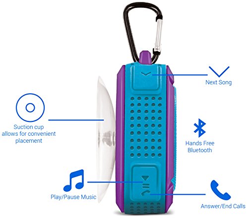 -. Feature : MULTIUSABILITY: For every place, for every device. Great for showers, baths, swimming pools, boats, marines, bbqs, beaches, nature adventure or just on the go / QUALITY YOU CAN COUNT ON: Rubberized red exterior for ultimate impact resistance. Beautiful multi layer design consisting of sealed silicon layer, durable material, and aluminum mesh to keep it safe. 360 full surround sound w/detail & clarity Detachable suction cup & Carabiner hook which allows you to attach the speaker for easy and convenient portability / COMPATILIBITY: Bluetooth compatible w/ 99% of the market (works great w/ iPhone, Samsung Galaxy, and Android Devices) + Siri compatible, connects to last connected device automatically. Bluetooth Range of 33 ft. Charges in 3 hours, plays up to 6 hours • MEDIA CONTROL: Skip songs and / MEDIA CONTROL: Skip songs and forward/back/pause/play right from the Advanced IPX4 (Ingress Protection) Certified water resistant speakers. Answer calls right on it and hold a conversation through the built in mic for hands free voice calls / INCLUDED IN BOX: Aduro AquaSound WSP60 Wireless Speaker, Carabiner Clip/Hook, Suction Cup, USB Charging Cord, User Manual
