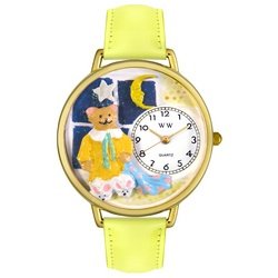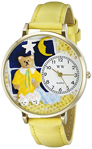 Amazon.com Celebrate your favorite teddy bear with the Whimsical Watches Unisex Night Teddy Bear Yellow Leather Watch #G0230006. This fun and fanciful watch features a fanciful teddy bear-themed scene alongside a circular white time display with gold-tone hands and Arabic numerals. Precise, high-quality Japanese quartz movement ensures time-keeping reliability, while the yellow leather band offers a secure, comfortable fit. A gold-tone stainless steel bezel surrounds the 42-millimeter case and rounds out the details of a watch that anyone who loves teddy bears is sure to appreciate. This whimsical watch is water resistant to 100 feet (30 meters). 0