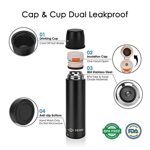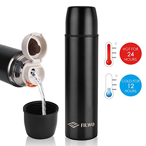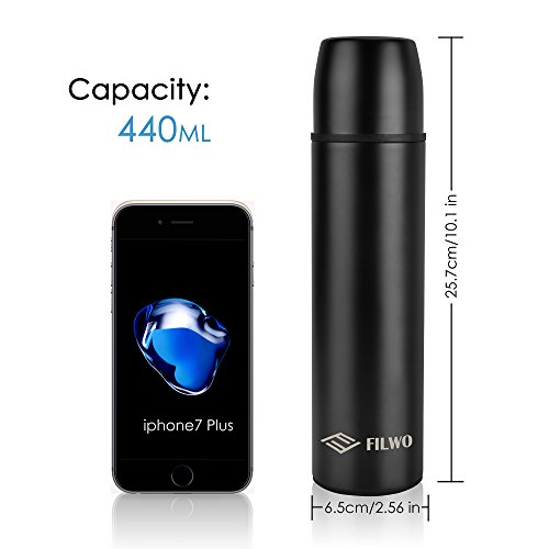 Vacuum Flask, FILWO Leak Proof Insulated Drink Flask with Cup, Stainless Steel Double Wall Tea Coffee Travel Mug, BPA Free ECO Friendly Sports Water Bottle, One Hand Open, 440ml 15oz (Black)