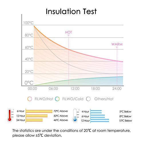 【KEEP HOT & COLD FOR HOURS】If you fill boiling water in this vacuum flask, about 94°-96°, in room temperature about 15°-25°, it can keep above 72° for at least 6h, keep above 52° for at least 12h, keep above 46° for at least 24h; If you fill in cold water, about -5°-5°, in room temperature about 15°-25°, it can keep below 5° for at least 4h, keep below 8° for at least 6h, keep below 15° for at least 12h.
