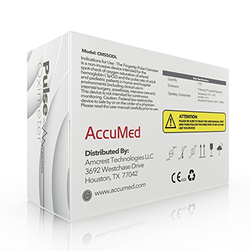 -. Binding : Misc. -. Brand : AccuMed -. Color : Blue -. EAN : 0616906995601 -. Feature : AccuMed's digital LED display with low power consumption plus auto-power off feature allows for 40 continuous hours of battery life. / Cover against ambient light offers superior ease of reading. Fast and accurate SpO2 and pulse measurements. / Accommodates pediatric to adult finger sizes and can be used by sports and exercise enthusiasts as well as anyone interested in measuring pulse rate and oxygen saturation. / Includes 2 AAA batteries, lanyard, and convenient carrying case. / Intended for sports and aviation users only. Guaranteed by 1 US year warranty offered exclusively by AccuMed. -. IsAdultProduct : 0 -. IsAutographed : 0 -. IsMemorabilia : 0 -. Label : AccuMed® -. Manufacturer : AccuMed® -. Model : CMS - 50DL-B -. MPN : AC-CMS-50DL -. PackageQuantity : 1 -. PartNumber : AC-CMS-50DL -. ProductGroup : Sports -. ProductTypeName : PERSONAL_CARE_APPLIANCE -. Publisher : AccuMed® -. Size : CMS-50DL -. Studio : AccuMed® -. Title : AccuMed® CMS-50DL Pulse Oximeter Finger Pulse Blood Oxygen SpO2 Monitor w/ Carrying case, Landyard Silicon Case & Battery (Blue) -. UPC : 616906995601