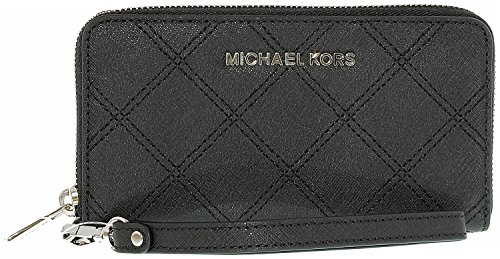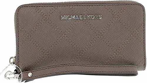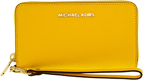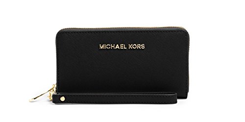 On-the-go yet ever glamorous, the Jet Set travel case keeps your cell phone, cards, and cash safe in one exceedingly luxurious place. By MICHAEL Michael Kors. Imported Saffiano leather Wristlet strap with 7" drop Top zip closure Exterior features gold-tone hardware Interior features1 cell phone pocket, 3 card holders and 1 open pocketFeature