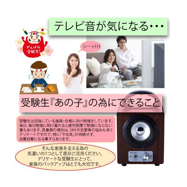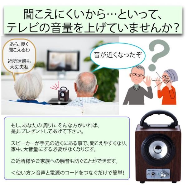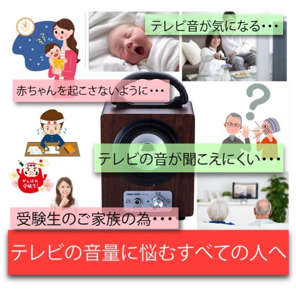 | 商品の説明 | ●赤ちゃんのいるご家庭や、耳の遠いお年寄りが周りを気にせずに放送を楽しめます! 耳の遠いご老人へのプレゼント、ギフトにも最適。 ●音楽プレイヤーやスマホに入れている音楽も再生可能! ●テレビのヘッドホンジャックにコードを接続するカンタン接続タイプです。 ●キッチンではテレビの音が聞こえないとき、これをキッチンに置けば料理中でもテレビの音がよく聞こえます。 ●複雑な接続や設定は不要で、コードの長さも約5メートルと使いやすく、大型テレビも離れて鑑賞することができます。 ●電源は、乾電池(別売)でも、付属のACアダプターを使用して家庭用コンセントに差し込んでも使用できます。 ●アンプ及びボリュームを内蔵しているため、テレビの音量を手元で自由に調節できます。 ●デザインは、どこか懐かしいイメージのエボニー風の木目調で、落ち着いた感じです。 ●乾電池使用時の電池寿命は、国産アルカリ乾電池使用の場合、約60時間程です。 |