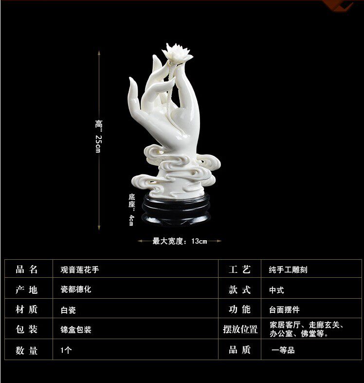 Feng Shui GuanYin Hand Buddha Ornament 佛教吉祥物观音玉手莲花摆件玉指拈花禅自生,祥云送瑞福满宅! 莲花是佛教的一种吉祥物,佛手是增福添寿的意思。莲花佛手寓意吉祥如意、福寿绵长。 宝贝用中国白瓷质独有的温润凝脂如玉瓷泥 ,手工传承国家非物质文化遗产中国白瓷雕烧制技艺 ;配有锦盒,送礼、自用两相宜。