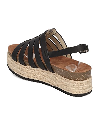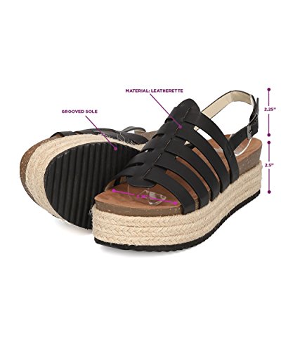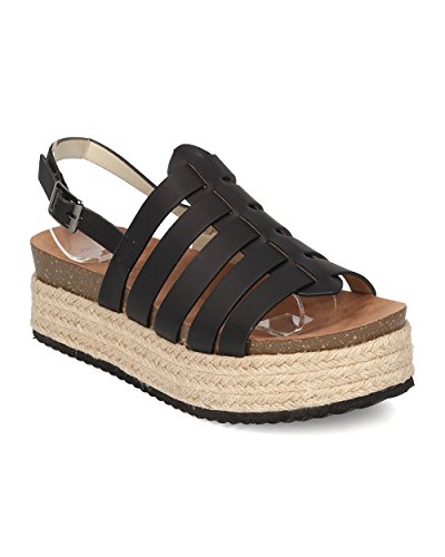 Product DescriptionThese leatherette sandals are made with an open toe, caged construction and thick flatform outsole. Also made with an espadrille covered outsole, molded footbed and slingback strap with adjustable buckle.0