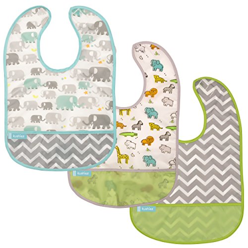 -. Title : Kushies Cleanbib Waterproof Bib 12M+ Neutral • 3-Pack White Little Safari / White Elephants / Green Chevron