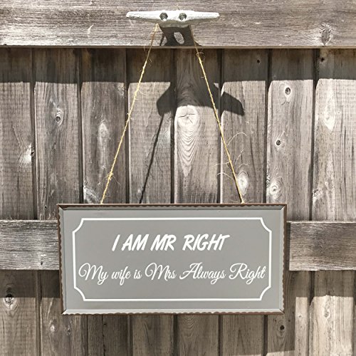 - I AM MR RIGHT, MY WIFE IS MRS ALWAYS RIGHT is the phrase printed in white scripted letters on a gray background that embellishes the face of this rustic style word art sign.