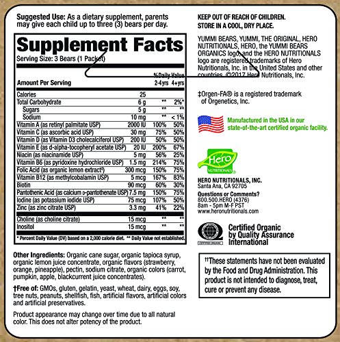 Yummi Bears Packs have 15 individual single serving packets of delicious and nutritious Yummi Bears Multi-Vitamin & Mineral gummy vitamins. Yummi Bears Multi-Vitamin & Mineral is the best vitamin for your child's overall health. Its 16 essential vitamins and minerals contain the proper amount of nutrients which are important for your child's growth and development. Our Multi-Vitamin and Mineral is specially formulated for your child and is Allergen-Free, Gluten-Free, Casein-Free, and made with all natural colors and flavors.Feature